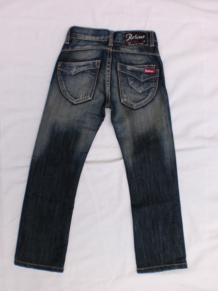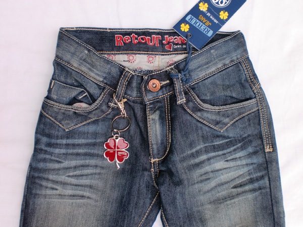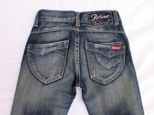 Coole Retour Jeans Domique in denim mit super cooler Waschung, Used-Look, 5-Poket-Style, tolle Taschensteppung vorne, zwei Popotaschen, mit Retour-Label-Knopf und kurzem Frontreißverschluss, Bundweite innen regulierbar, mit Glücks-Kleeblatt-Schlüsselanhänger.