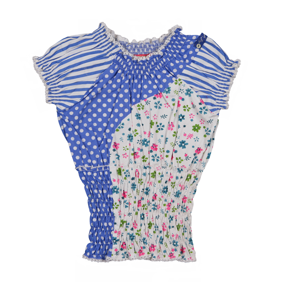 Bezaubernde Bluse von Mim-Pi im Mustermix blau-weiss, geraffter Halsausschnitt, gepuffte Ärmel, gesmokte Bauchpartie, passt perfekt zum Rock in blau-weiss.