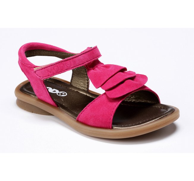Die vorliegende Sandale JENVOLE ist aus Velourleder in Fuchsia gearbeitet. Die schlichte Sandale besticht durch die aufgesetzten Rüschen. Zu Schliessen ist die Mädchensandale mit einem Klettverschluss, und ist somit gut an den Fuss anpassbar. Die Leder Innensohle ist weich gepolstert und die rutschfeste Gummisohle ist optisch an die Mädchensandale angepasst. Das Fersenriemchen ist gepolstert.