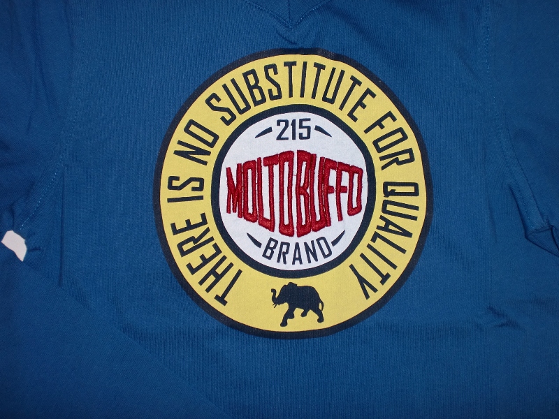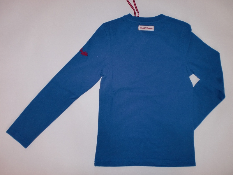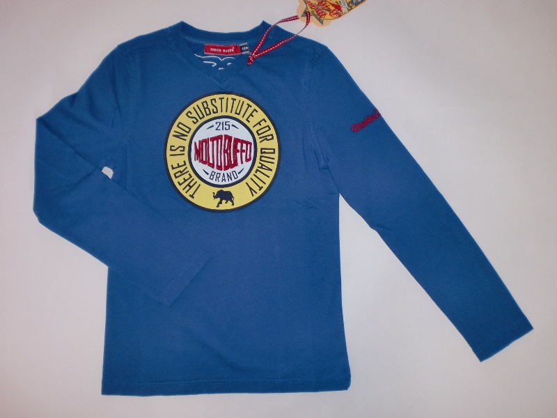 Super cooles Longsleeve/Langarm-Shirt von Molto Buffo in true blue mit Kreis-Print und Logo-Stickerei vorne, V-Ausschnitt, Logo-Stickerei auf dem linken Arm und auf der Rückseite ist ein kleines Patch. Sehr angenehmes Material.