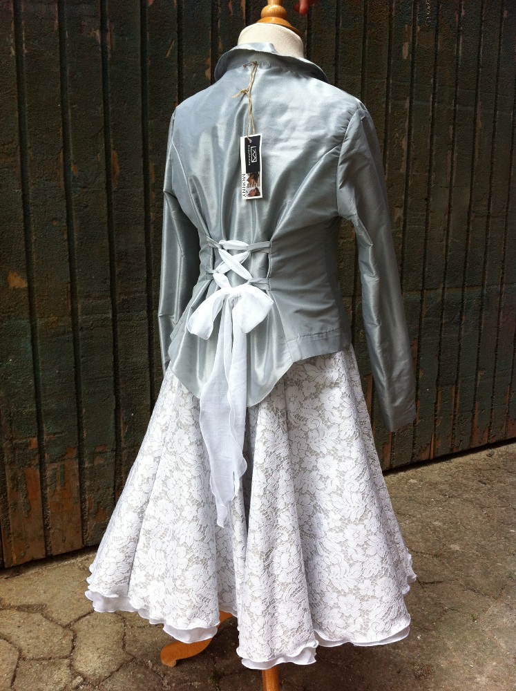 Verspielter Blazer mit einem Schößchen hinten und mit einem weißen Band weitenregulierbar. Sehr edel.