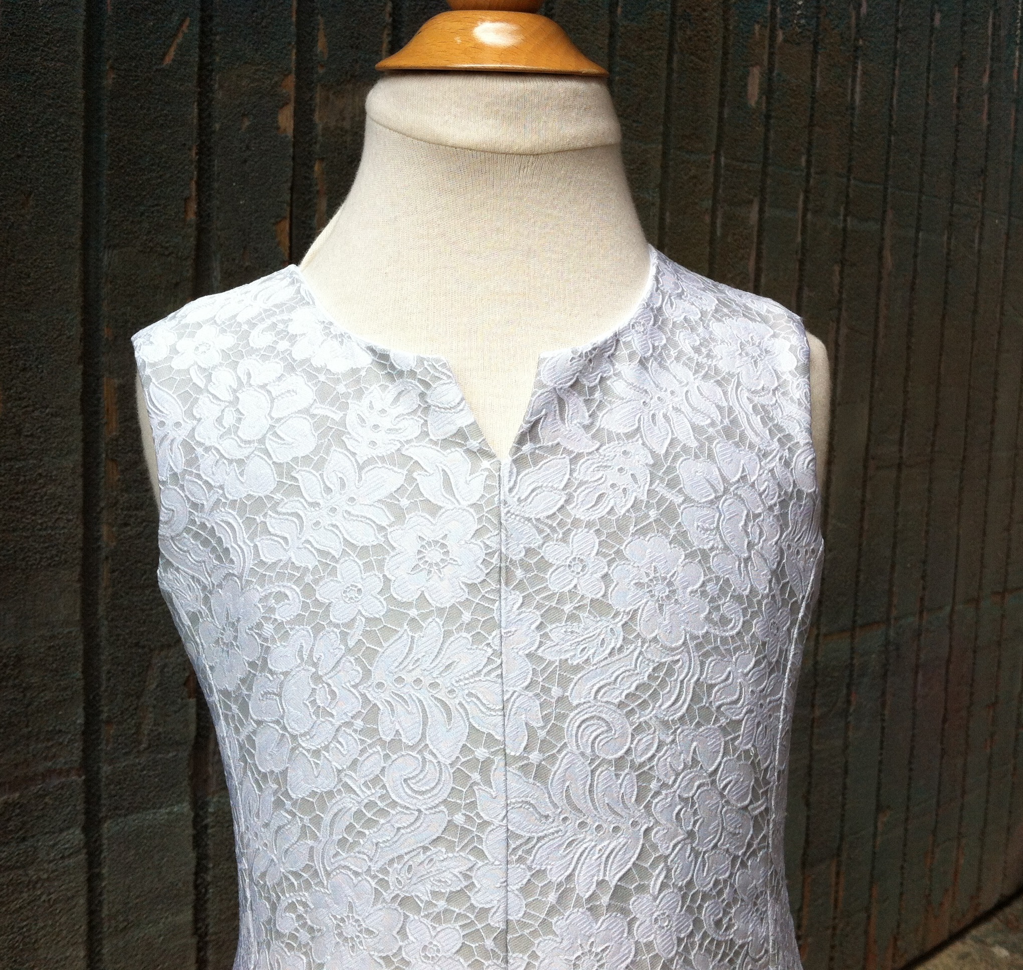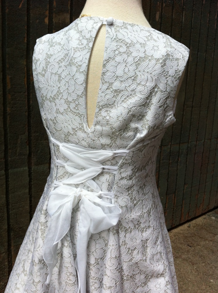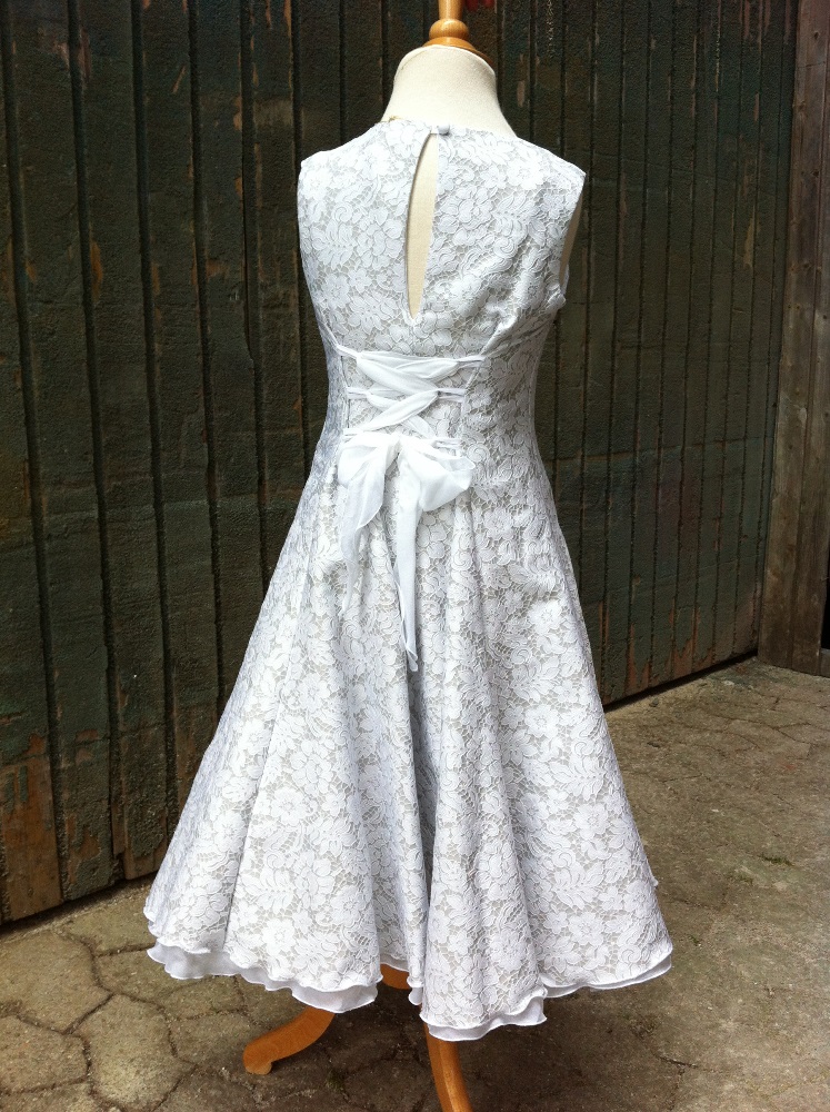 Ausgefallenes Kommunionkleid, wunderschönes gewebtes Muster in grau, exklusiv in Design und Form, doppellagig gearbeitet, die untere Lage endet mit einer Tüllrüsche, seitlicher Reißverschluss. Am Rücken mit wunderbarer Schnürung zur Weitenregulierung.