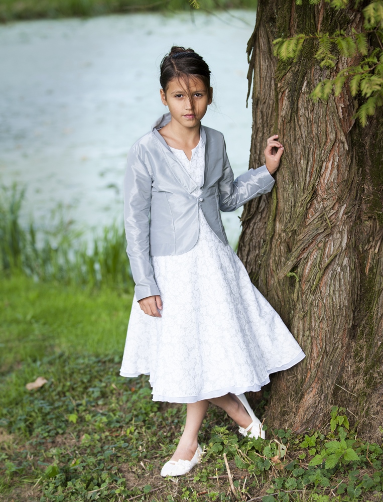 Hier bieten wir Ihnen ein Kommunionkleid bzw. festives Kleid mit passendem Blazer der Extraklasse aus dem Hause Monny zum Verkauf an.
