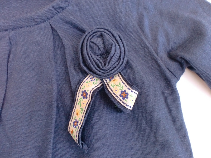 Verspieltes Langarm-Shirt / Longsleeve von Paglie in blau, an den Armenden und am Bund ein schmaler Gummizug, vorne am Halsausschnitt mit schönen Falten und ein schönes abnehmbares Blumen-Patch.