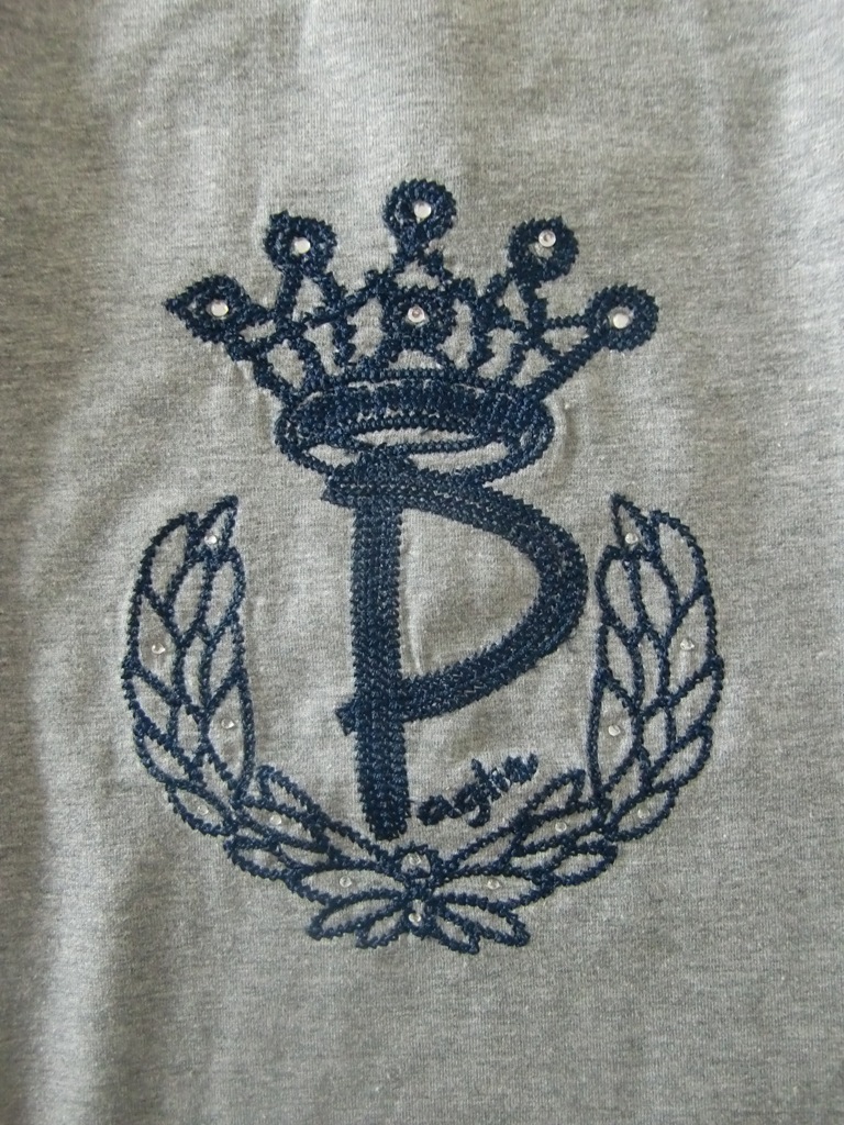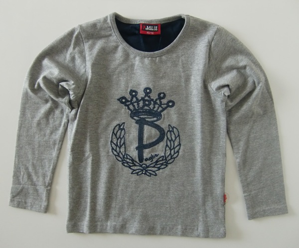 Wunderschönes Langarmshirt von Paglie in grey melange mit Print in Stickerei mit Steinen in navy, Markenfahne in der Seitennaht.