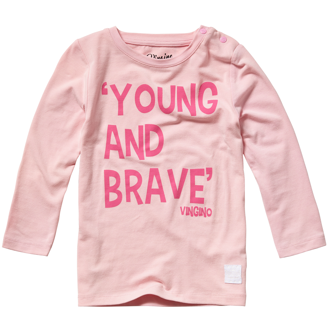 Schönes Langarm-Shirt für die Kleinen Mädels mit "YOUNG AND BRAVE"-Front-Print. Die Druckknöpfe an der Schulter stehen für ein sorgenfreies An- und Ausziehen.